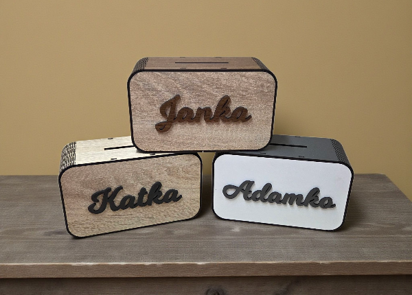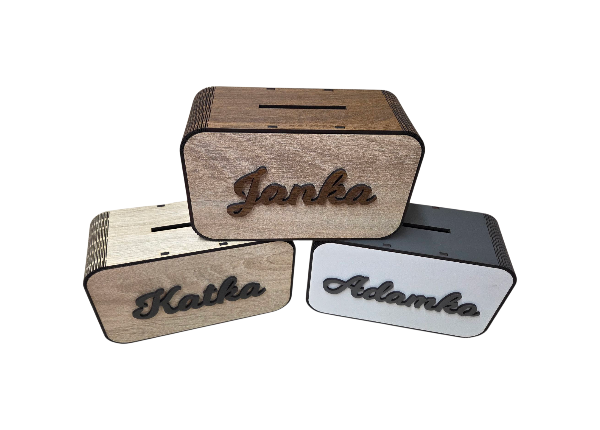 Dřevěná 3D pokladnička se jménem nebo nápisem
