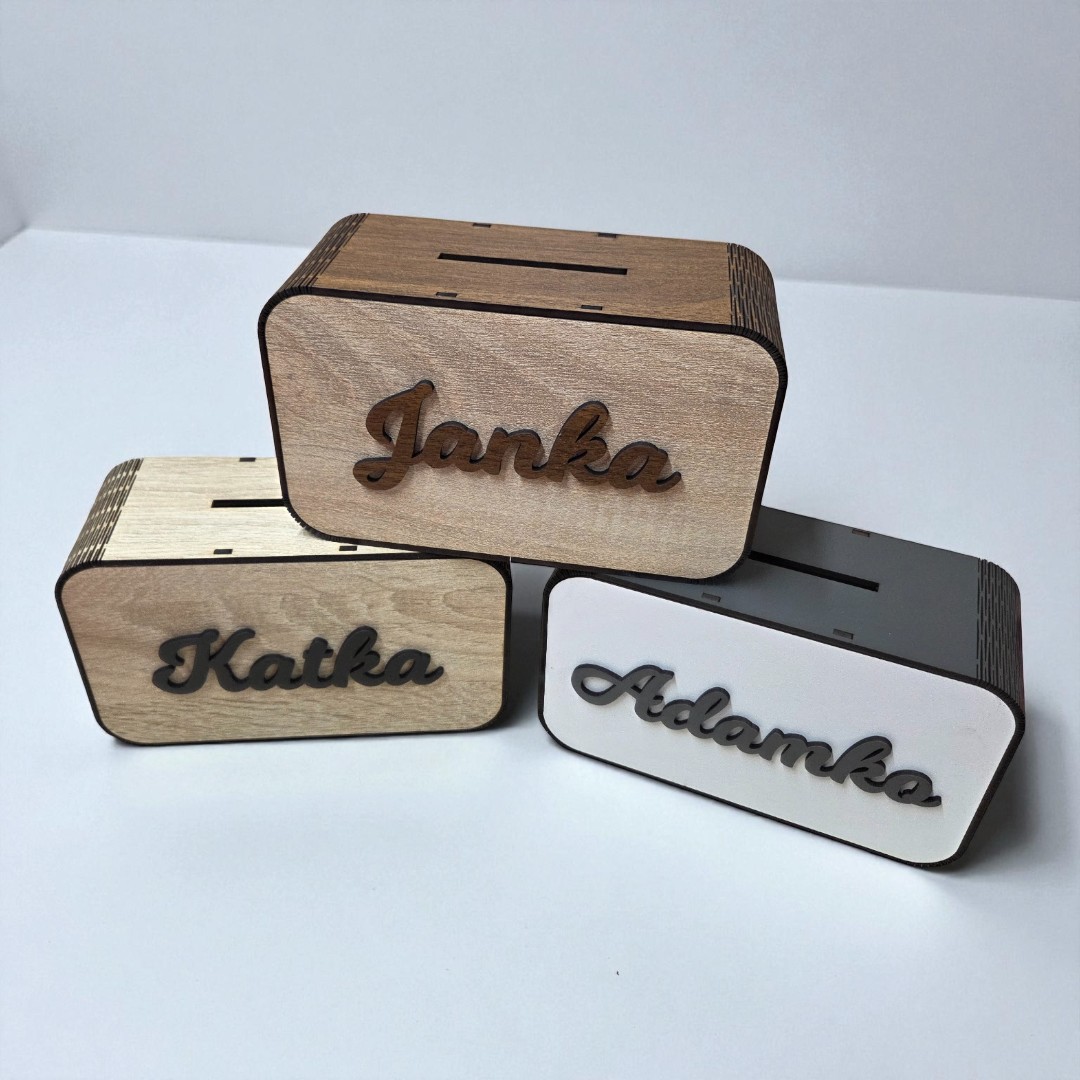 | Dárek na míru✨ Originální 3D pokladnička ze dřeva – krásný a osobní dárek pro děti i dospělé.Každý kus je ručně vyroben z kvalitního dřeva a doplněn o vyřezávané dřevěné jméno nebo nápis v 3D efektu...