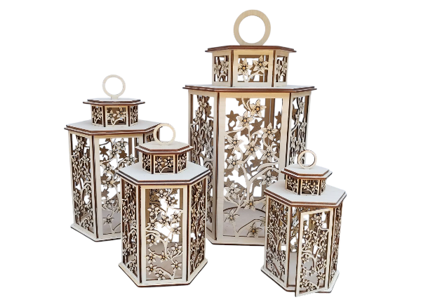 - Dřevěná lucerna s jemným květinovým designem