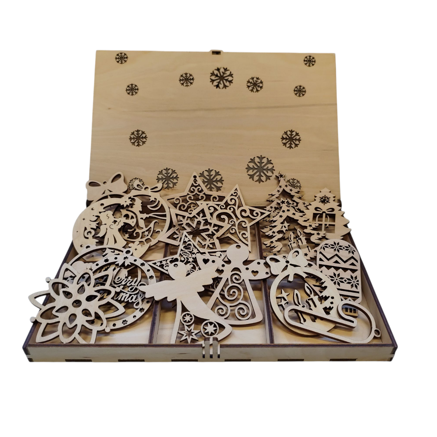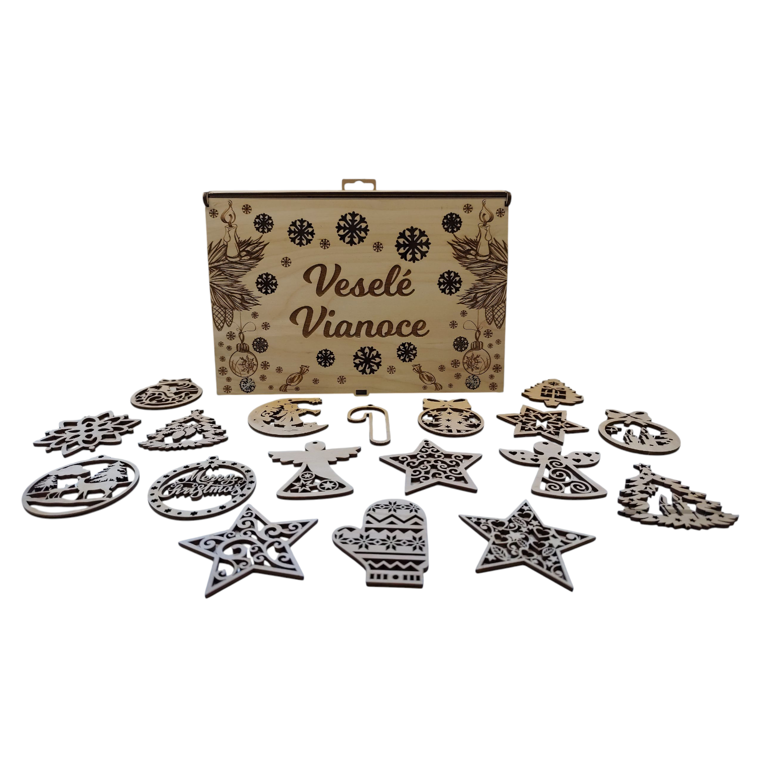 Dřevěné vánoční ozdoby v dárkové krabičce – Veselé Vánoce (18 ks)