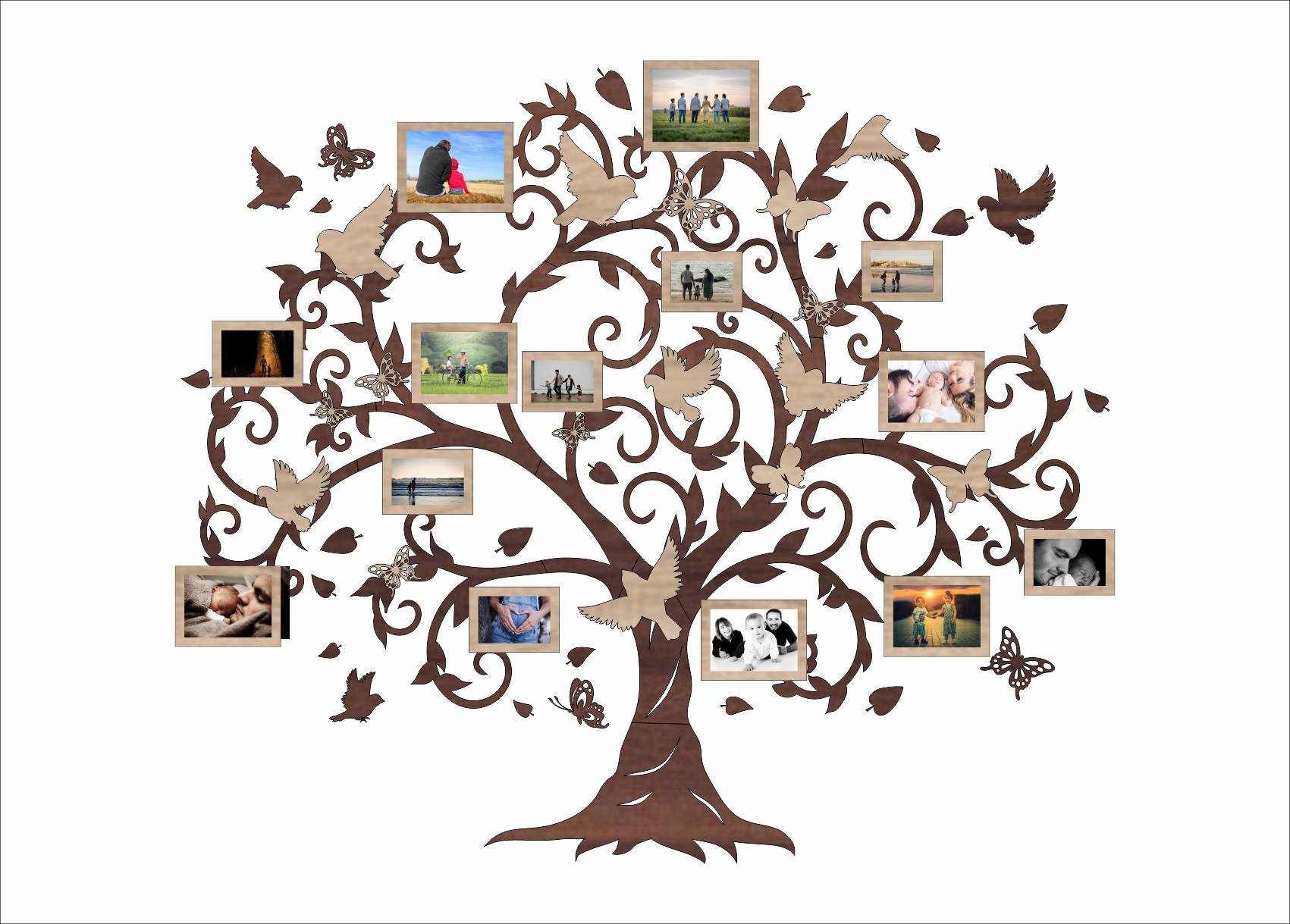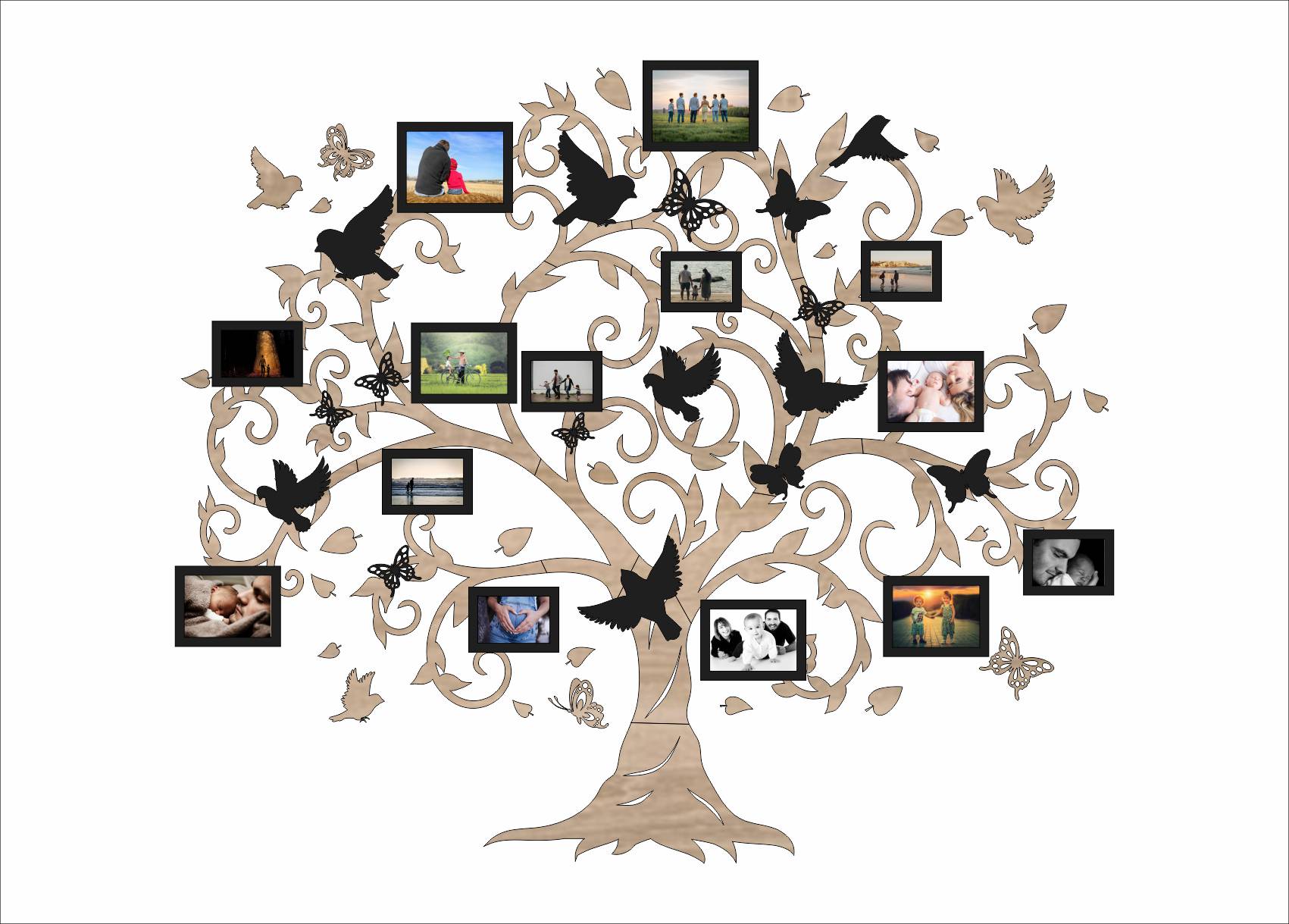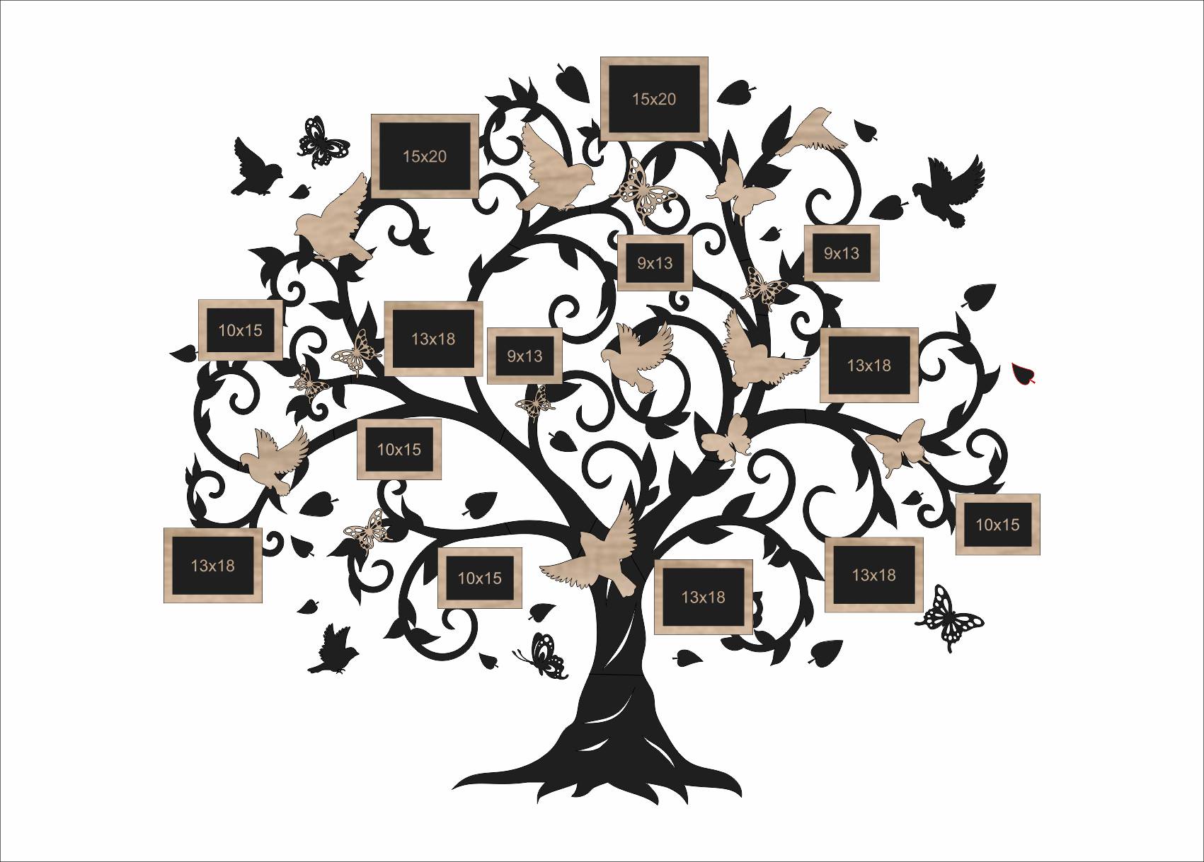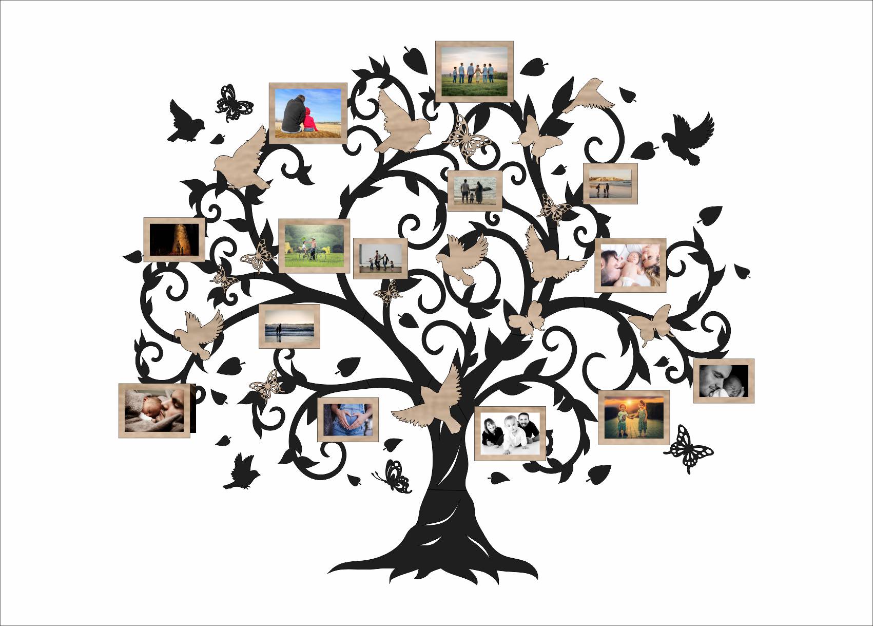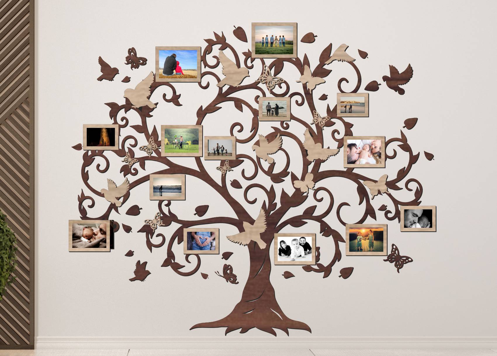 Dřevěný fotorámeček na zeď ve tvaru rodinného stromu s ptáčky a motýly je výrazná bytová dekorace, která promění prázdnou stěnu v osobní rodinnou galerii. Bohatě zdobené větve, jemné ornamenty, ptáčci a motýli vytvářejí lehký a harmonický motiv plný života a pohybu.
