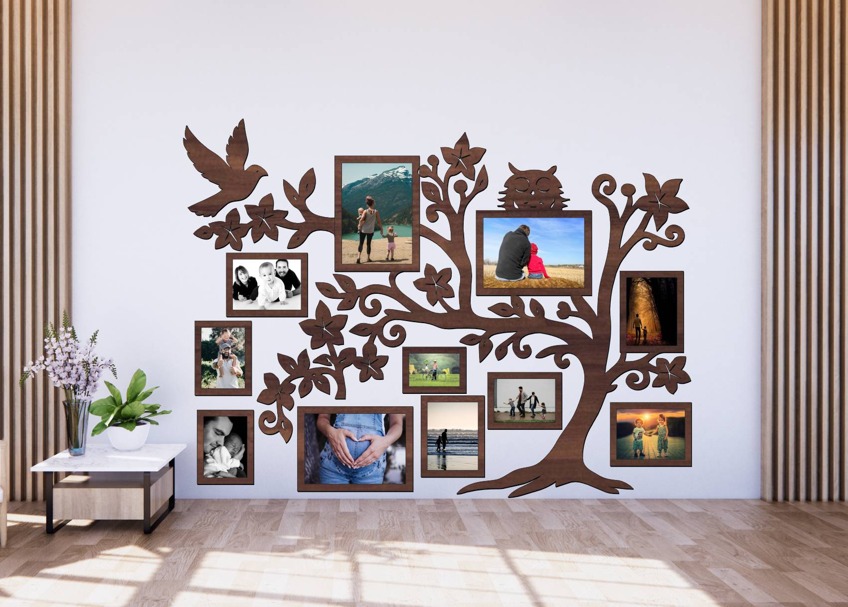 Dřevěný fotorámeček na zeď – Rodinný strom se sovičkou a ptáčkem je originální rodinná dekorace, která propojuje fotografie a přírodní motiv do jednoho harmonického celku. Motiv stromu doplněný o sovičku a ptáčka působí klidně, útulně a dekorativně.