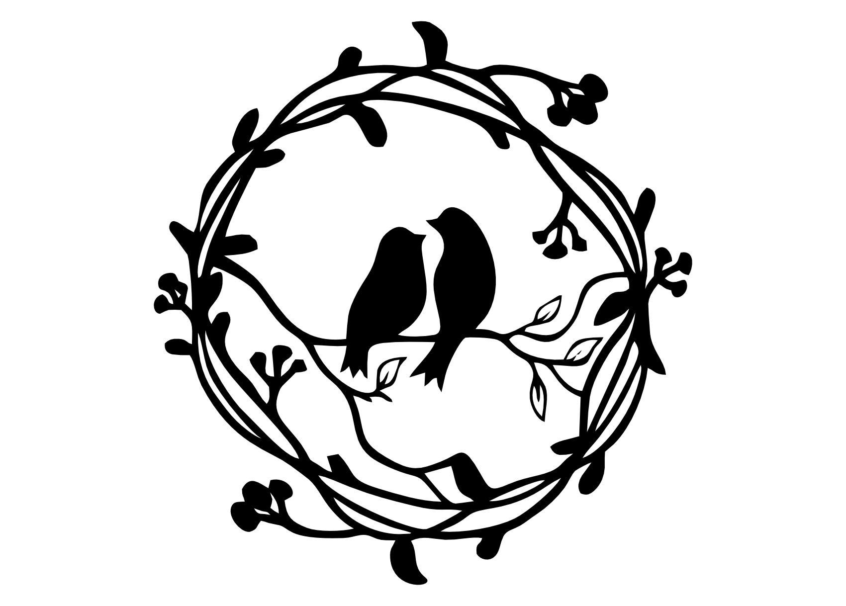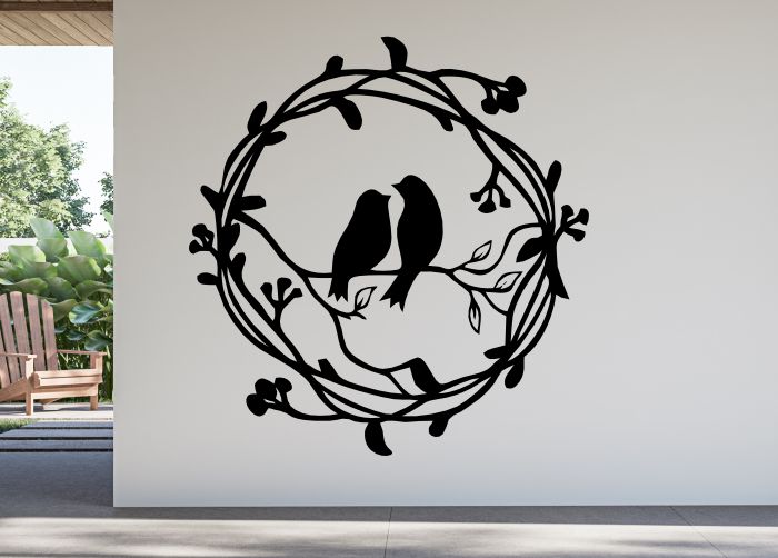Dřevěný obraz – Ptáčci v kruhu z větviček je jemná a harmonická dekorace s romantickým přírodním motivem. Siluety dvou ptáčků a kruh spletený z větviček působí elegantně a útulně, takže se hodí do ložnice, obýváku, předsíně či na chatu.