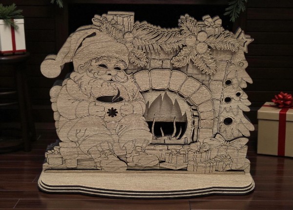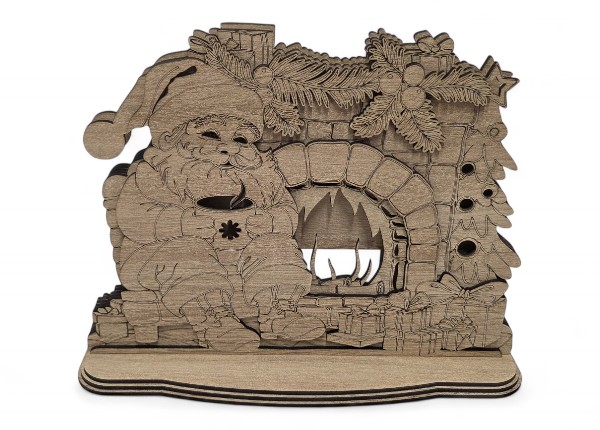Každý detail je precizně vyřezán laserem – kameny na krbu, větvičky, ozdoby i postava samotného Santy. Stabilní podstavec zajišťuje pevné umístění na polici, komodě nebo na zimním stole.