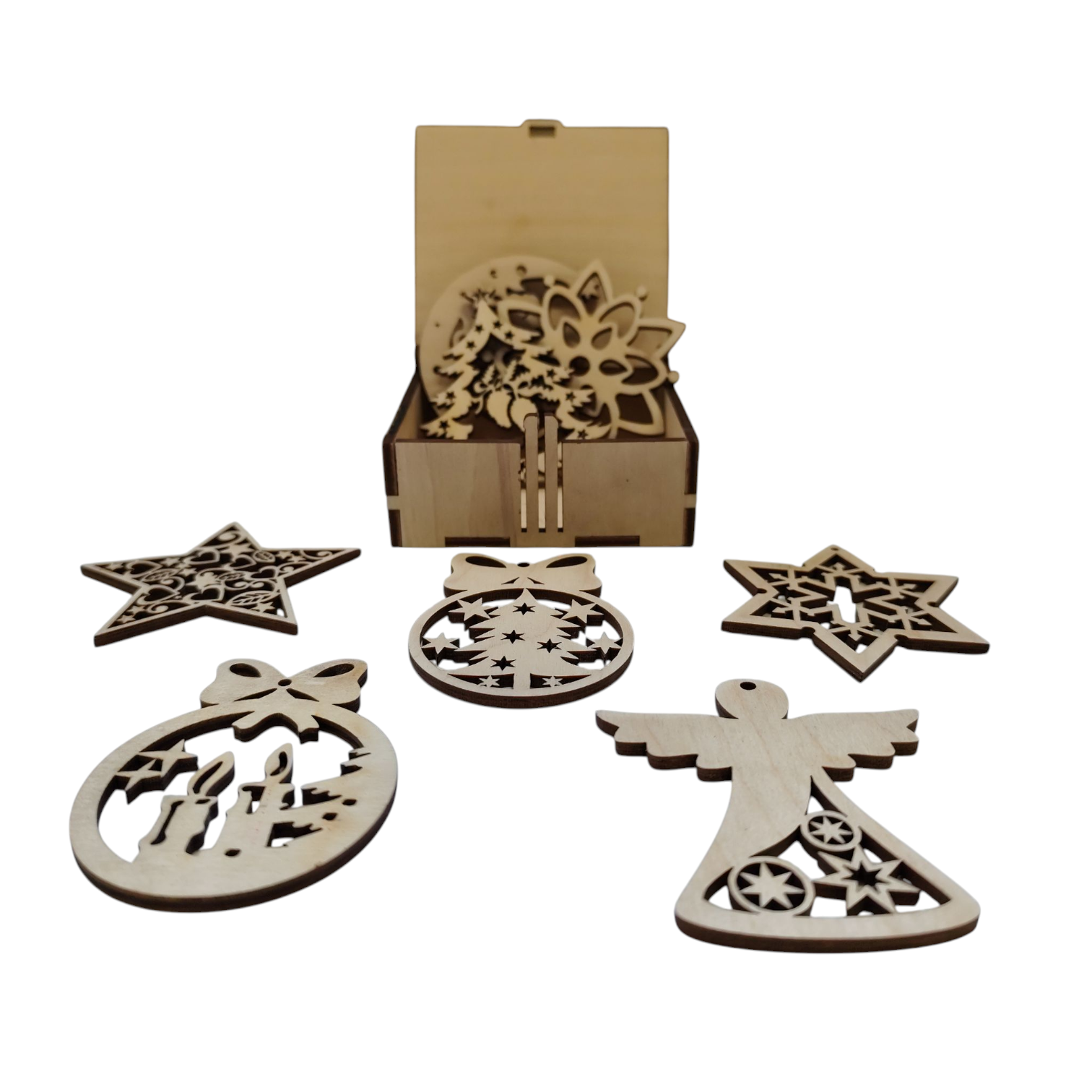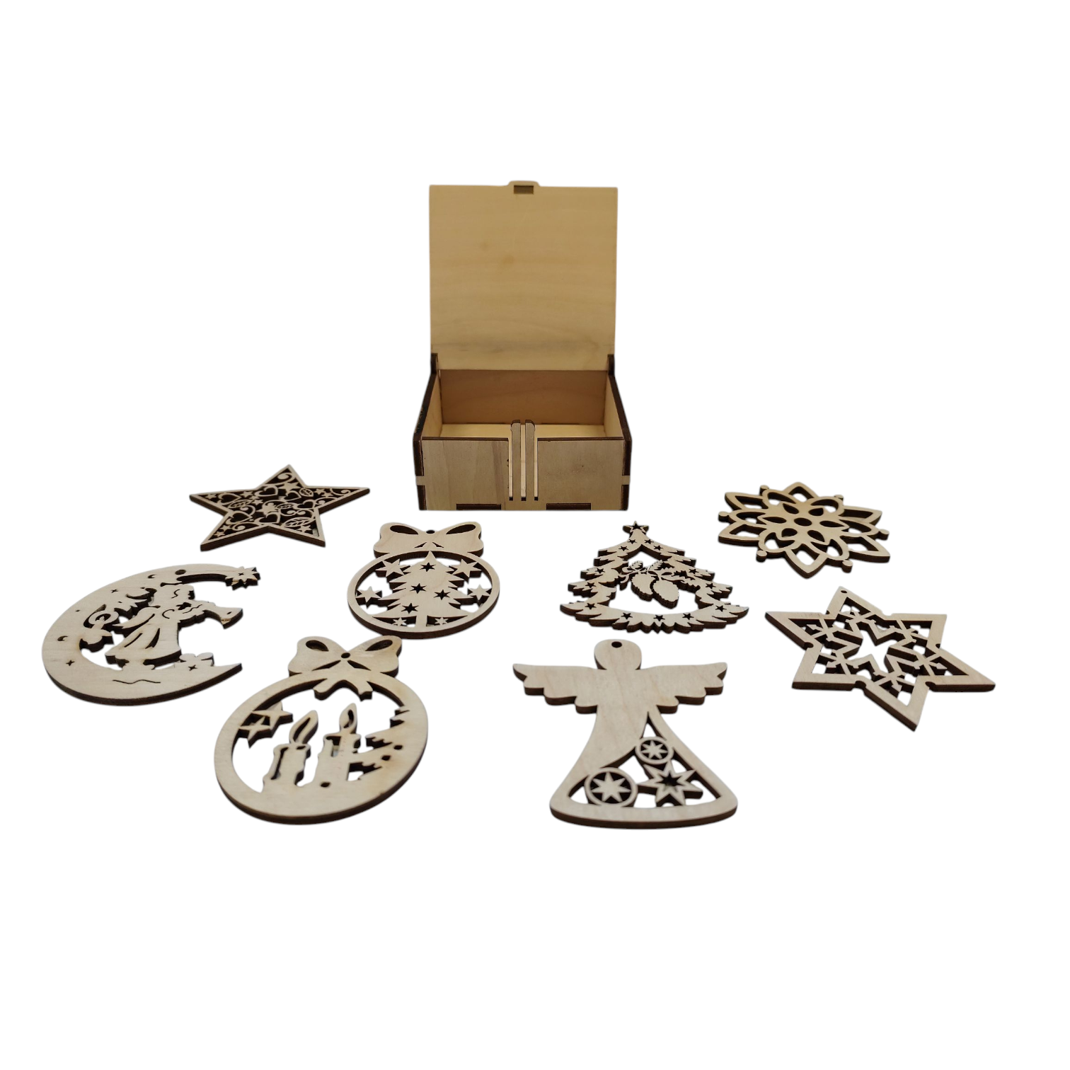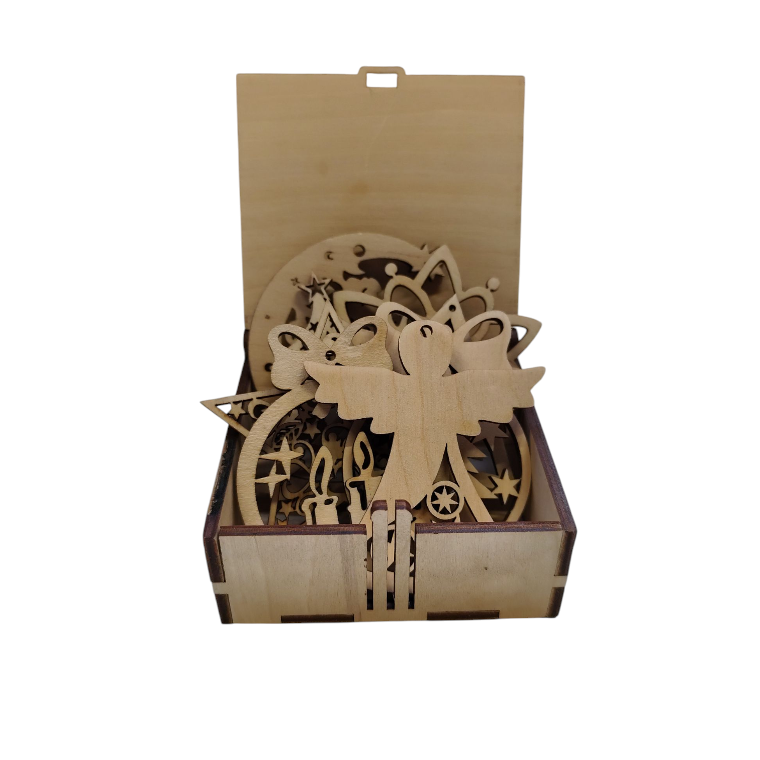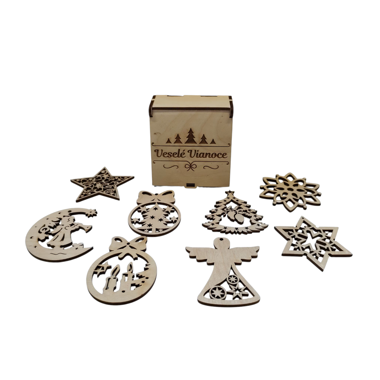 Ozdoby jsou lehké, pevné a díky laserovému řezání mají krásné čisté detaily. Dřevěná krabička s nápisem „Veselé Vánoce“ je ideální pro uložení i jako stylový dárek.